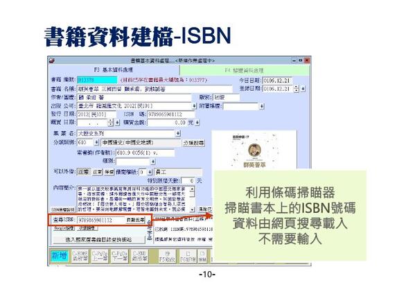 新增書籍資料時,直接輸入或利用條碼掃瞄器掃讀新書上的ISBN號碼 。 系統直接搜尋網路上的圖書館資料庫,將該本書的基本資料自動帶入檔,節省新建圖書資料輸入及檢查圖書基本資料的時間。(一本不用10秒鐘)