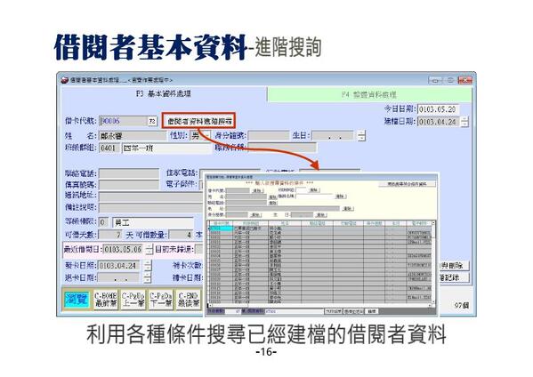 ◇借閱者基本資料紀錄,可直接查看借閱的歷史紀錄,含未還、逾期等。