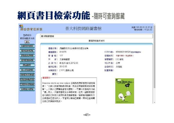 不需要到圖書館,只要上網,就可查詢圖書館的籍資訊,可預借與續借。