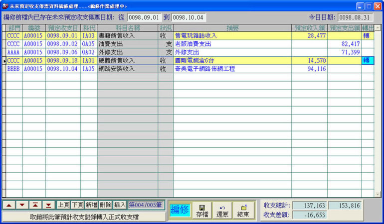 未來預定收支傳票資料編修處理